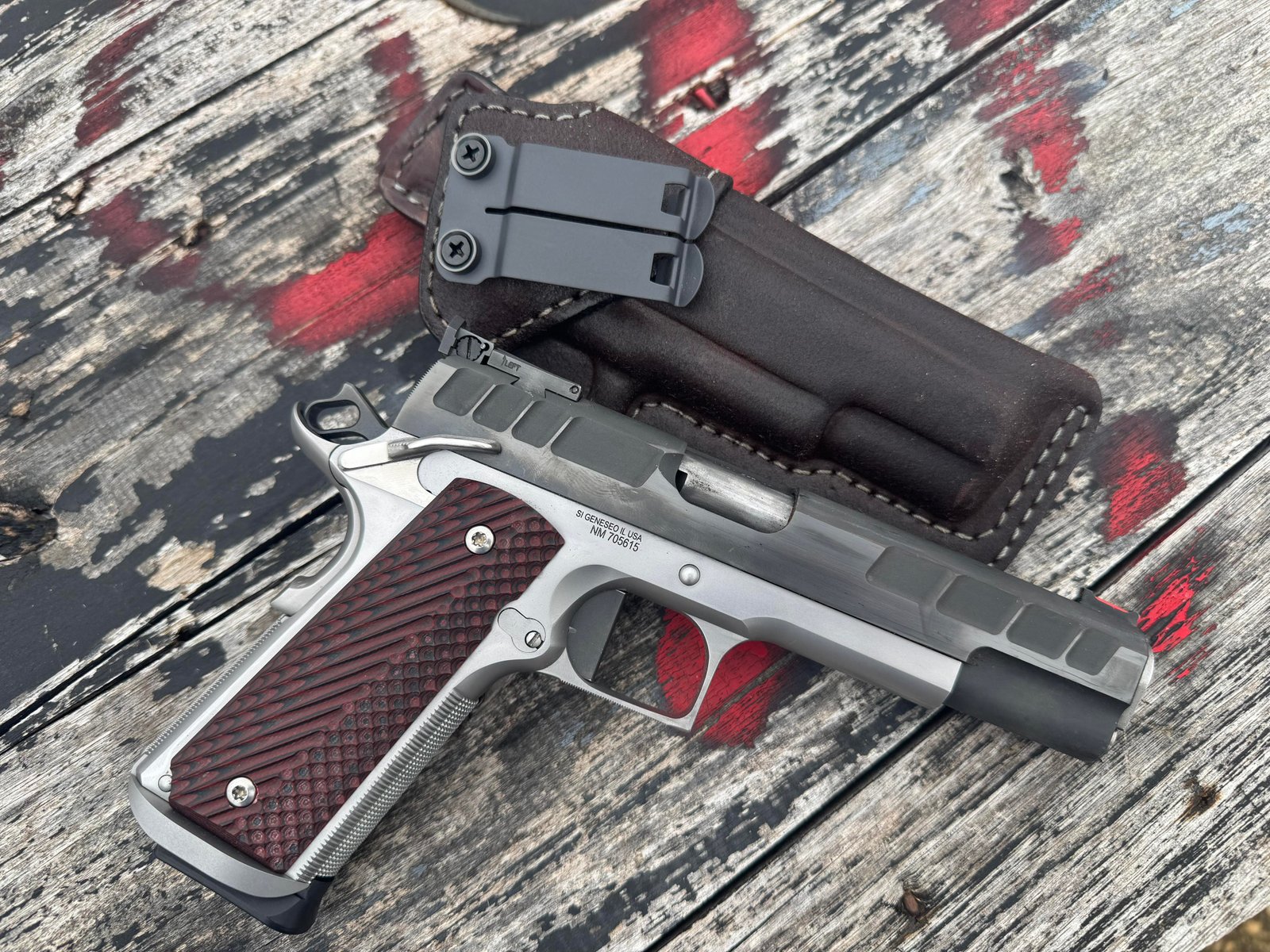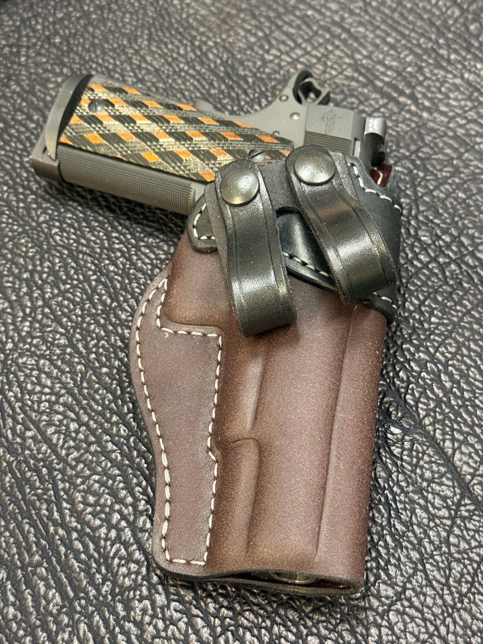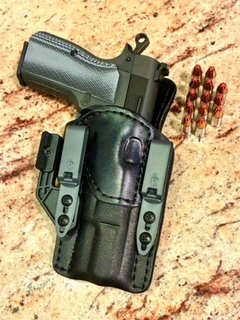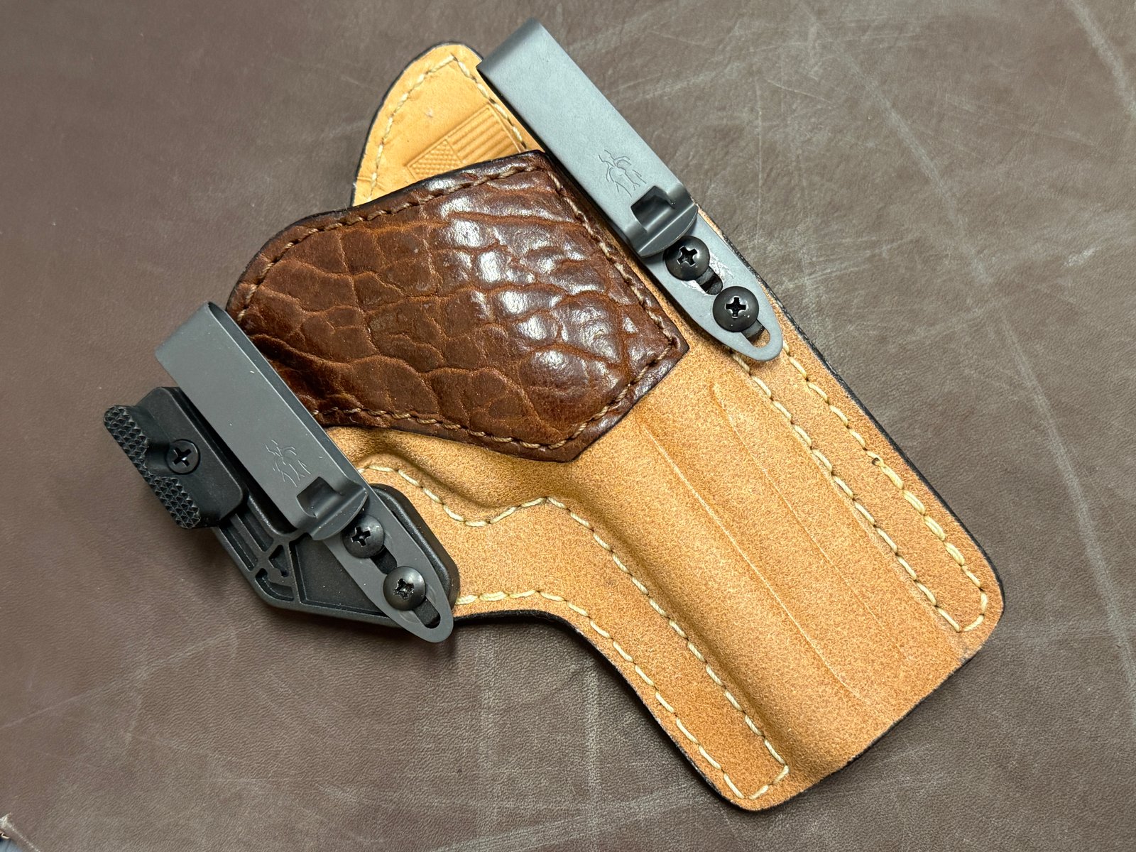 **Please know you can remove the reinforced mouth and/or the steel band and I will deduct the difference from the total price. You can also replace the cowhide reinforcement with kangaroo to keep it slim and keep the steel band. The steel band I use is thin but strong. It does not add thickness to the holster in a way that you would "feel".
