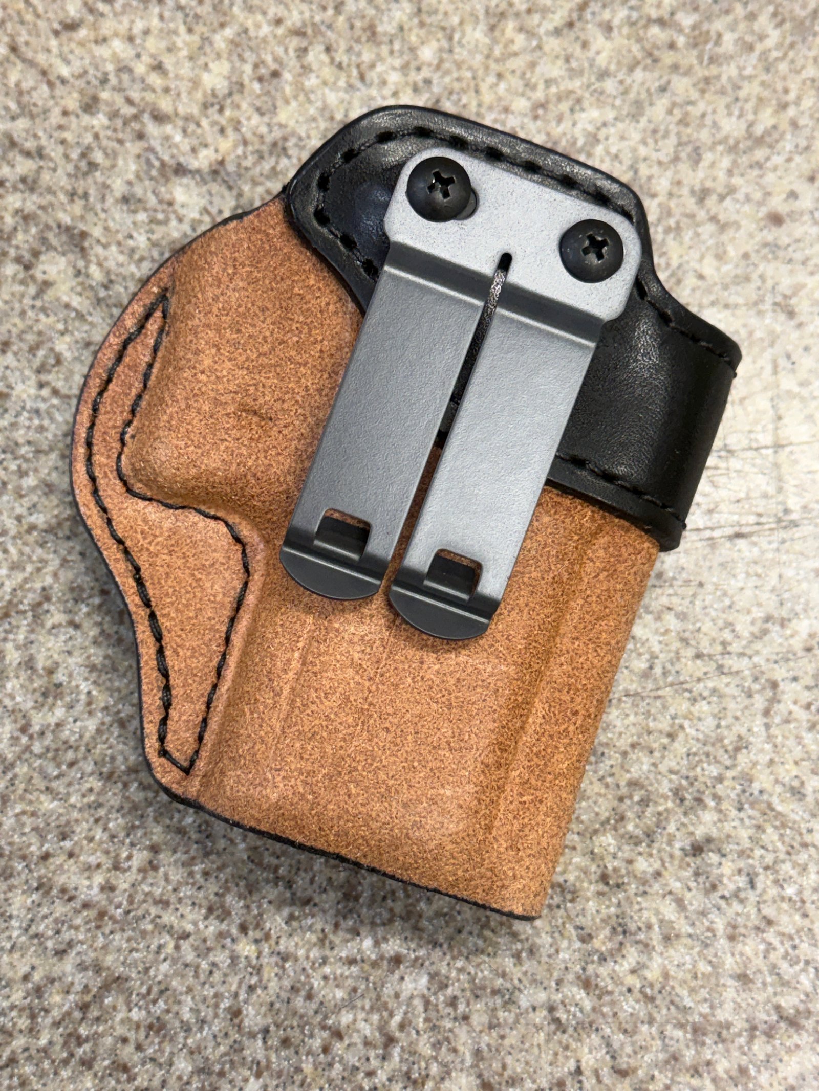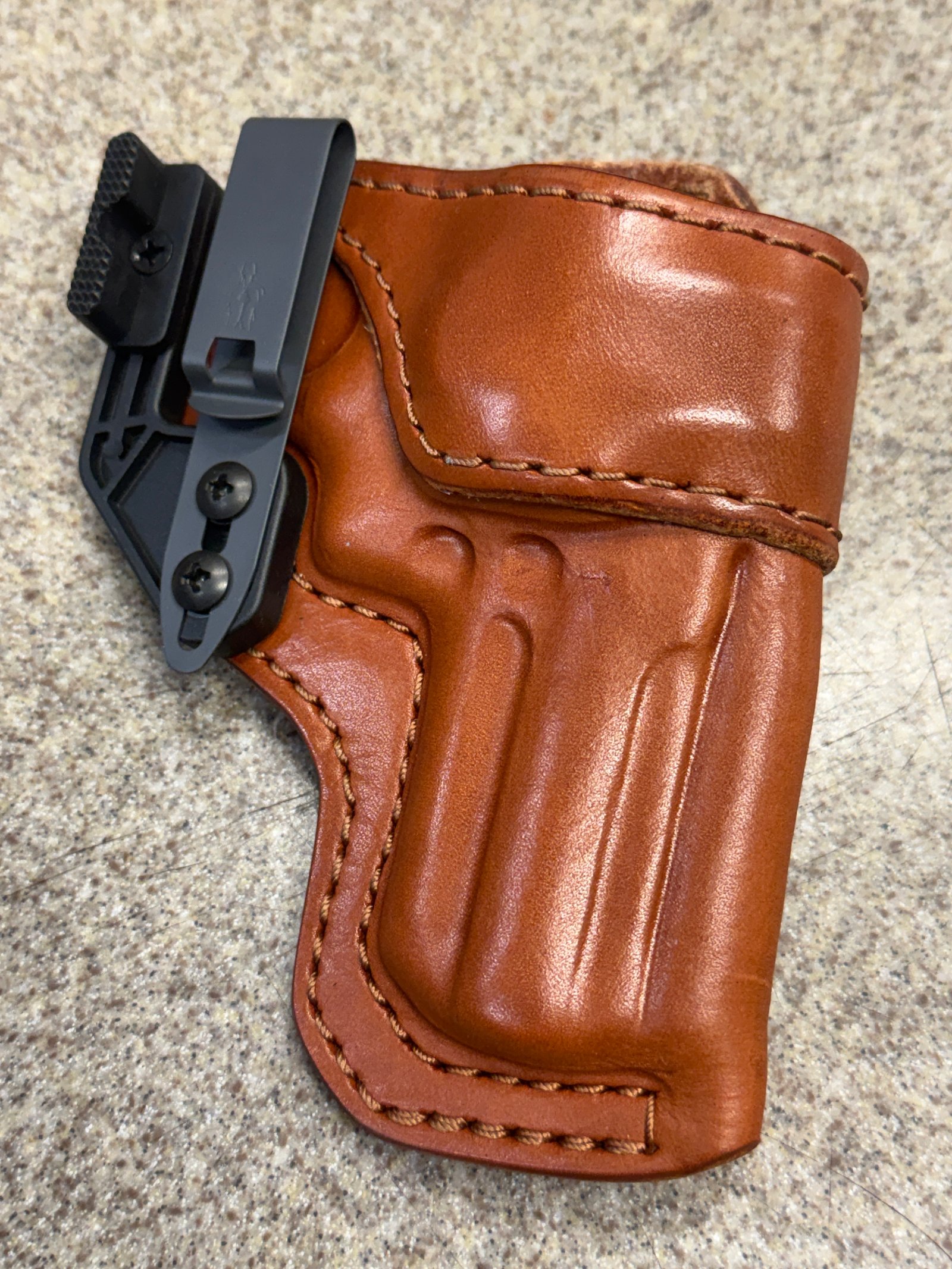 This is my personal prototype for the Hew. It was built for my 4" SAI Champion LW Operator (4" 1911 with rail). This will work for an EDC X9 or similar 1911. No optic. Half shirt guard. G Code clips. It has additional holes for an OWB option I was messing with but it didn't pull close enough to the body.