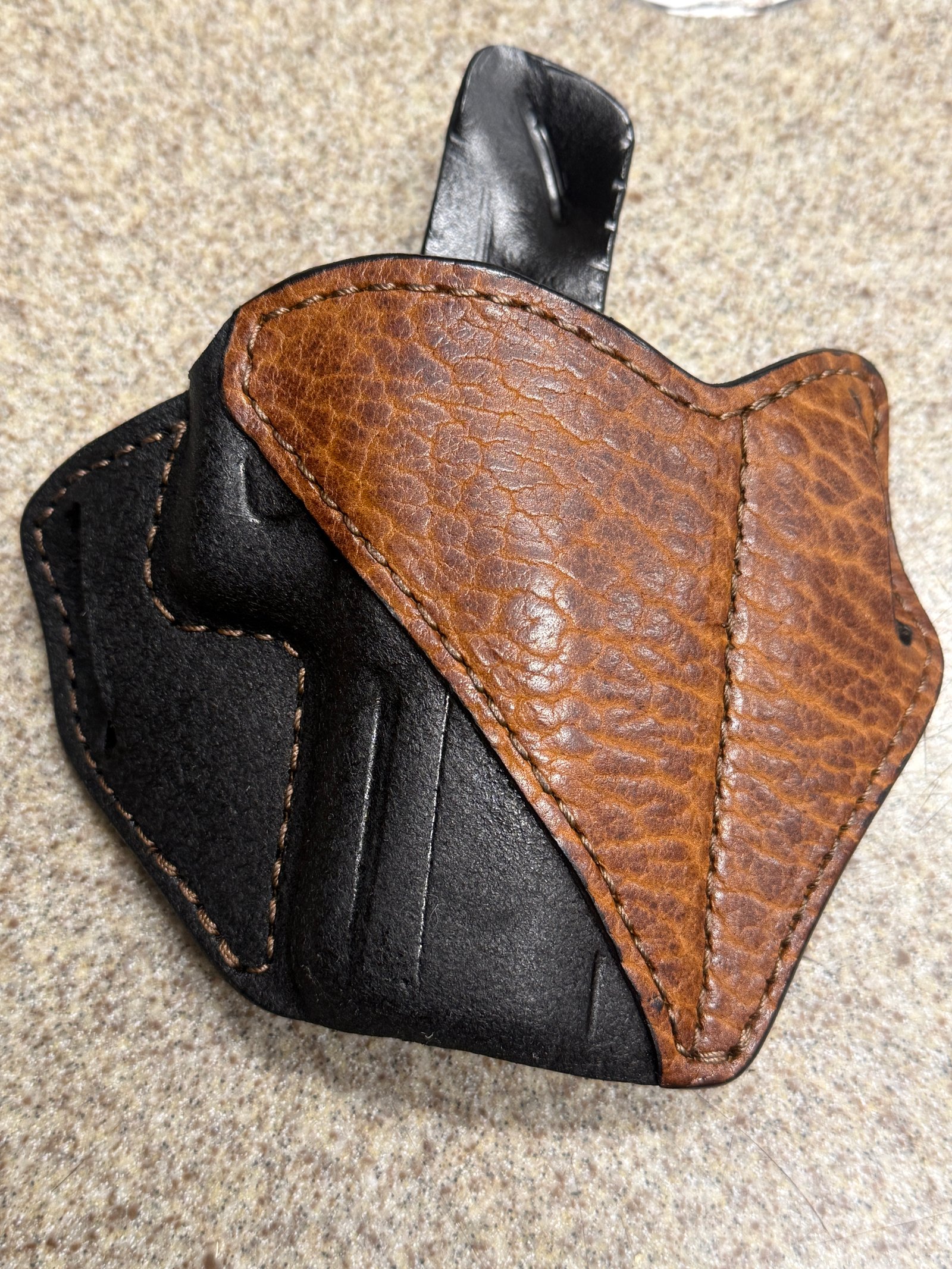 Right, black with black elephant, 1.5" belt slot, full shirt guard, 10 deg, mid high ride, open muzzle
