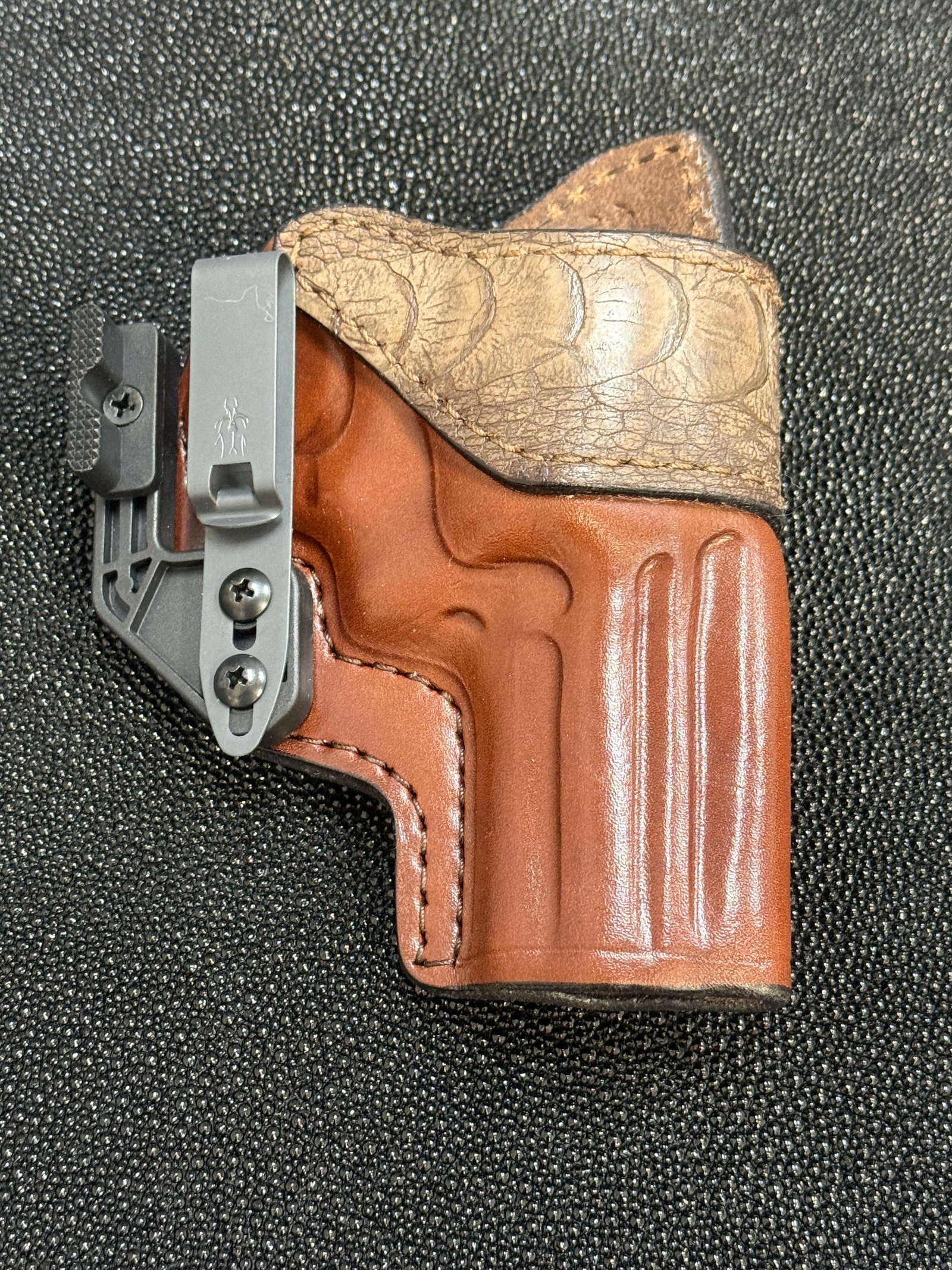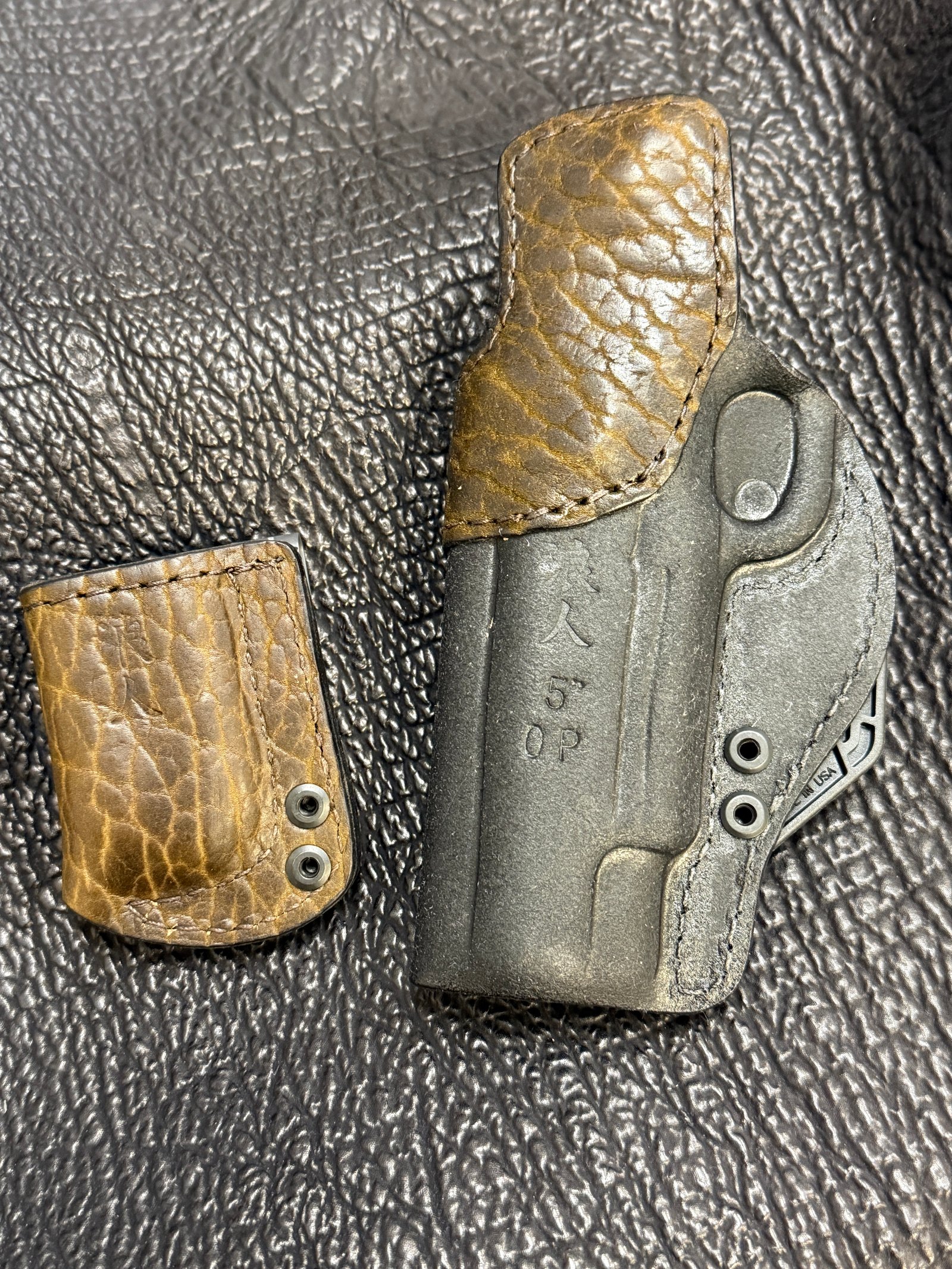 Holster: Right, black rough out body, mossy green bison trim, steel band, 1.5" height adjustable DCC clips, Modwing, half shirt guard, open muzzle.
