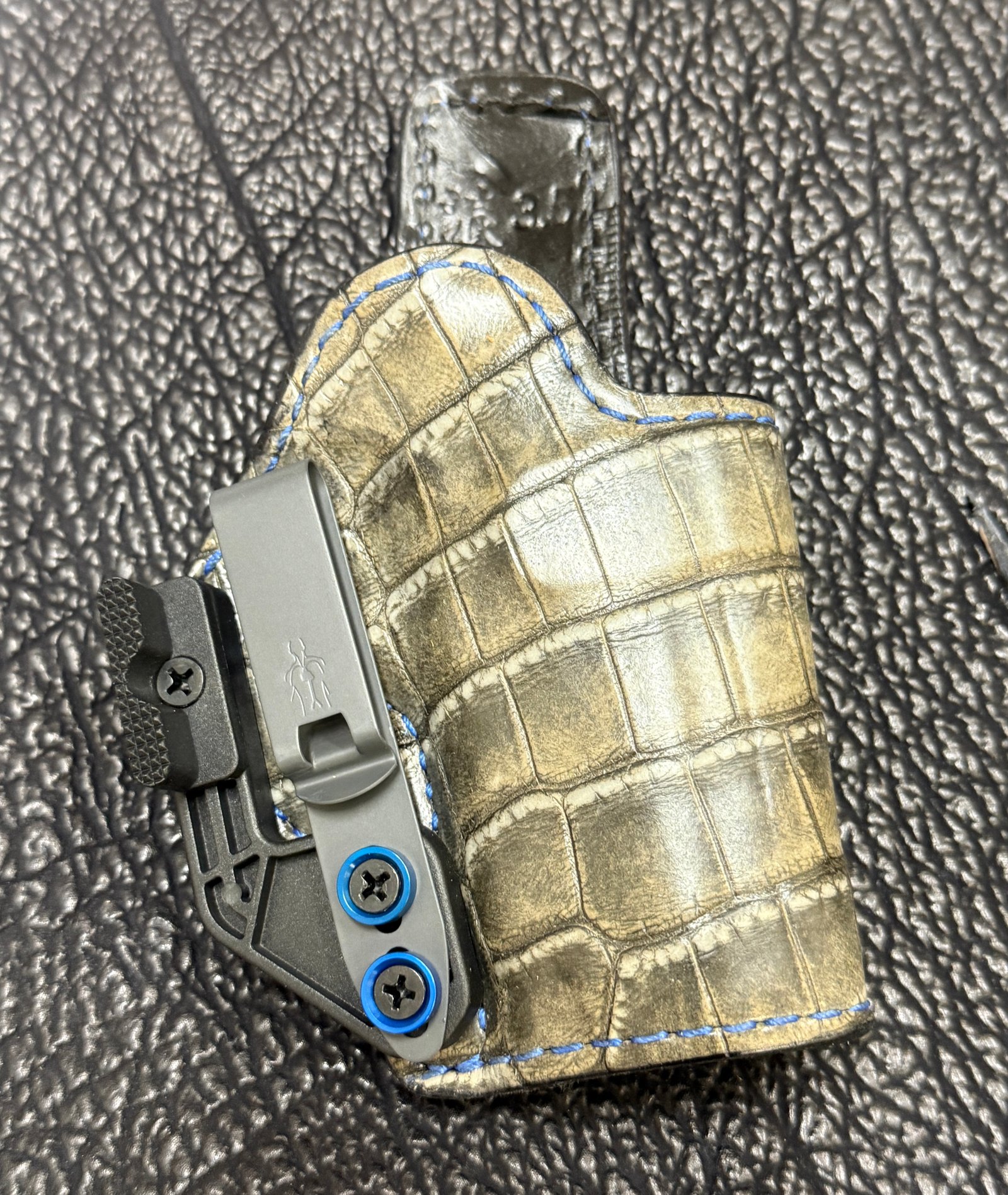 Built for a 5" 1911 with rail, no optic. Black, aqua/gold crocodile belly, 15 deg, 1.5" belt, open muzzle