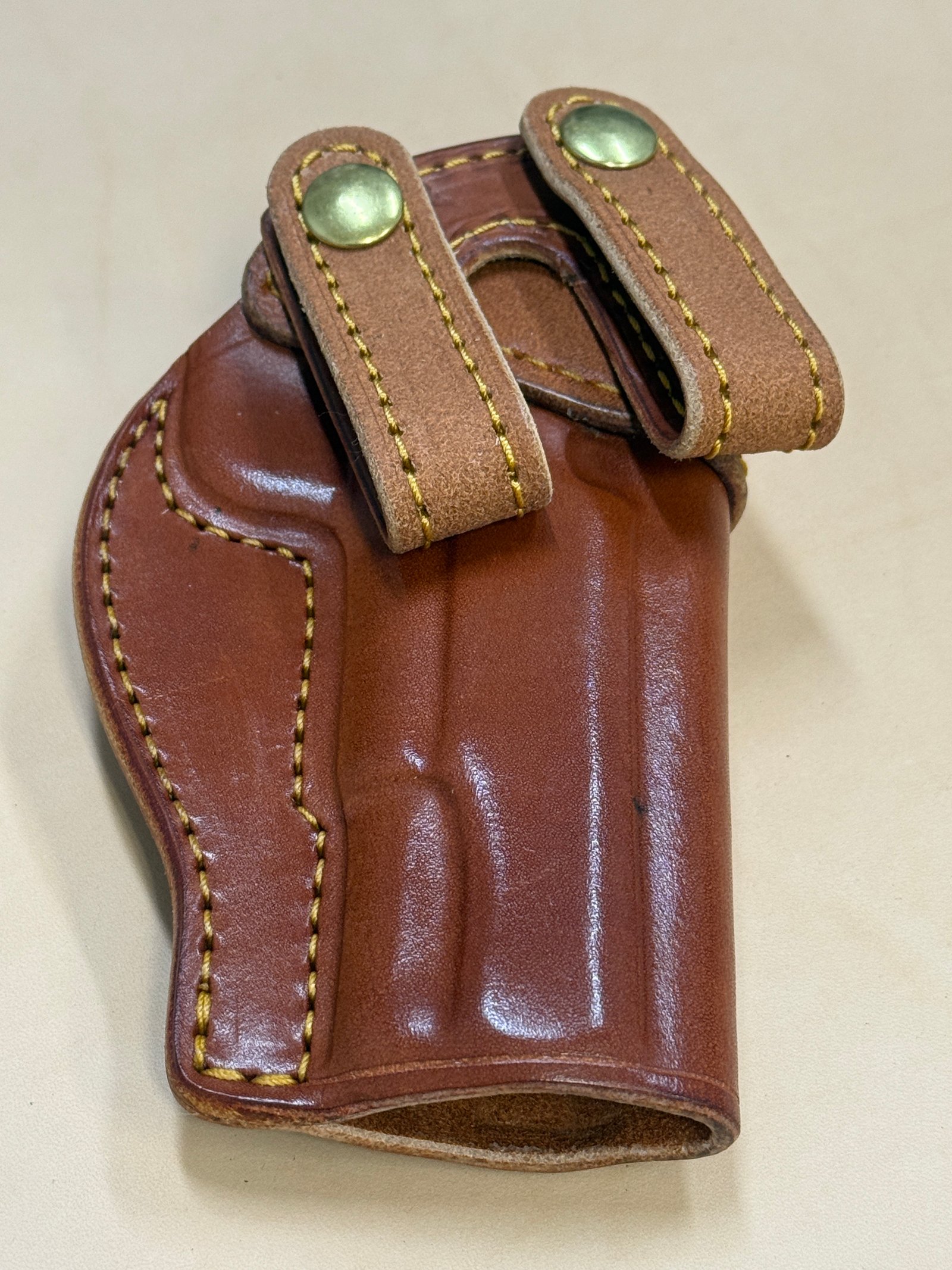 Built for a 5" Government/TRP non-rail, no optic. Right, 17 degrees, no shirt guard, chestnut slick body, chestnut rough out reinforcement and 1.5" snap loops, gold thread, brass snap, open muzzle. Note the small black dot partway down the slide, near the sight channel.
